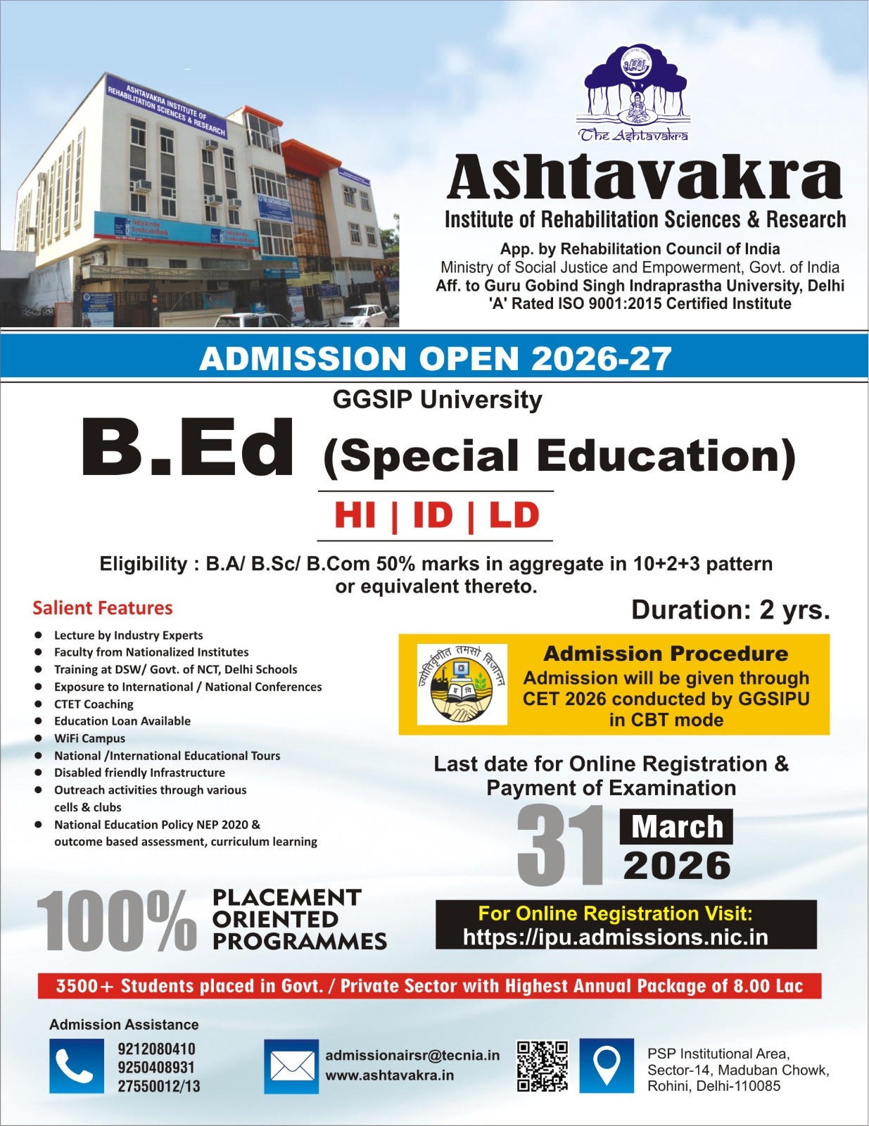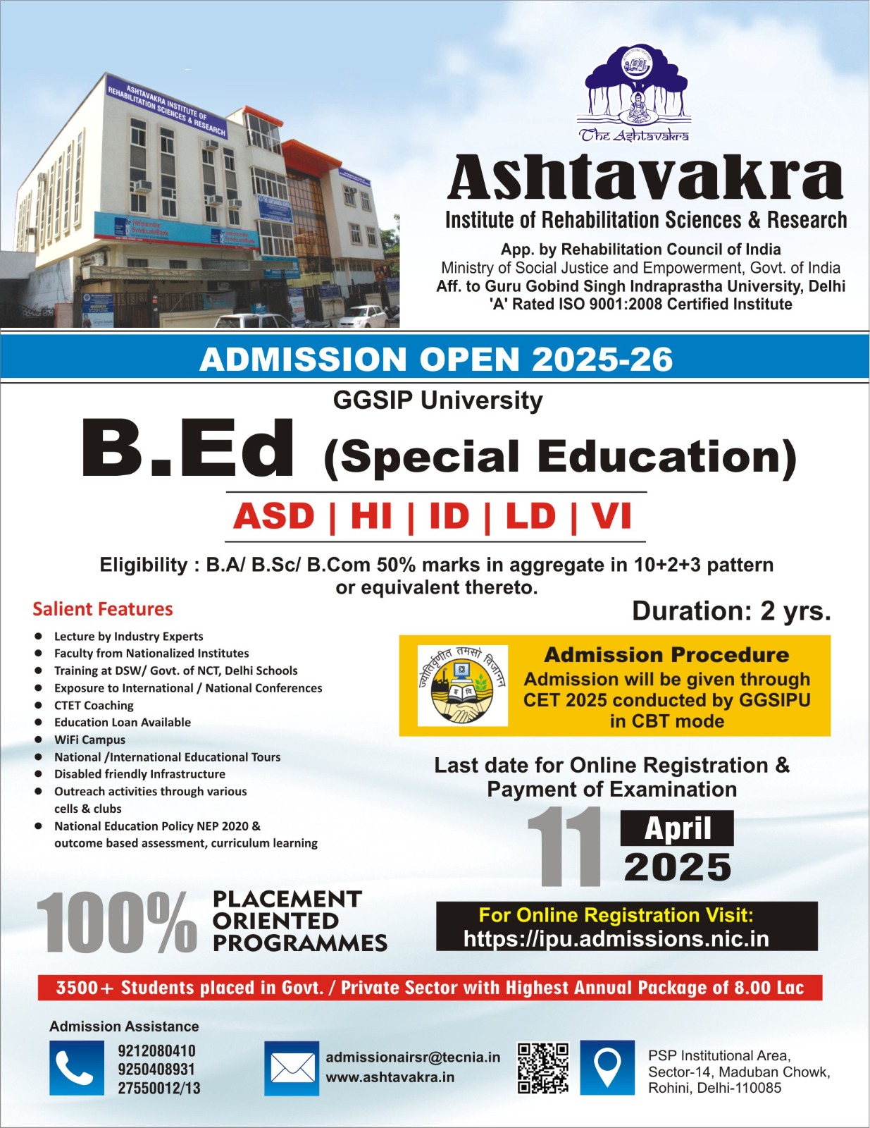 Ashtavakra Institute of Rehabilitation Sciences and Research is an ISO 9001:2008 certified ’A’ rated institute approved by Rehabilitation Council of India, a statutory body under Ministry of Social Justice and Empowerment, Govt. of India and affiliated to Guru Gobind Singh Indraprastha University, Delhi, located at the hub of institutional area of North Delhi in a barrier free environment with metro connectivity, working in the field of disability for the welfare of Person with Disabilities.