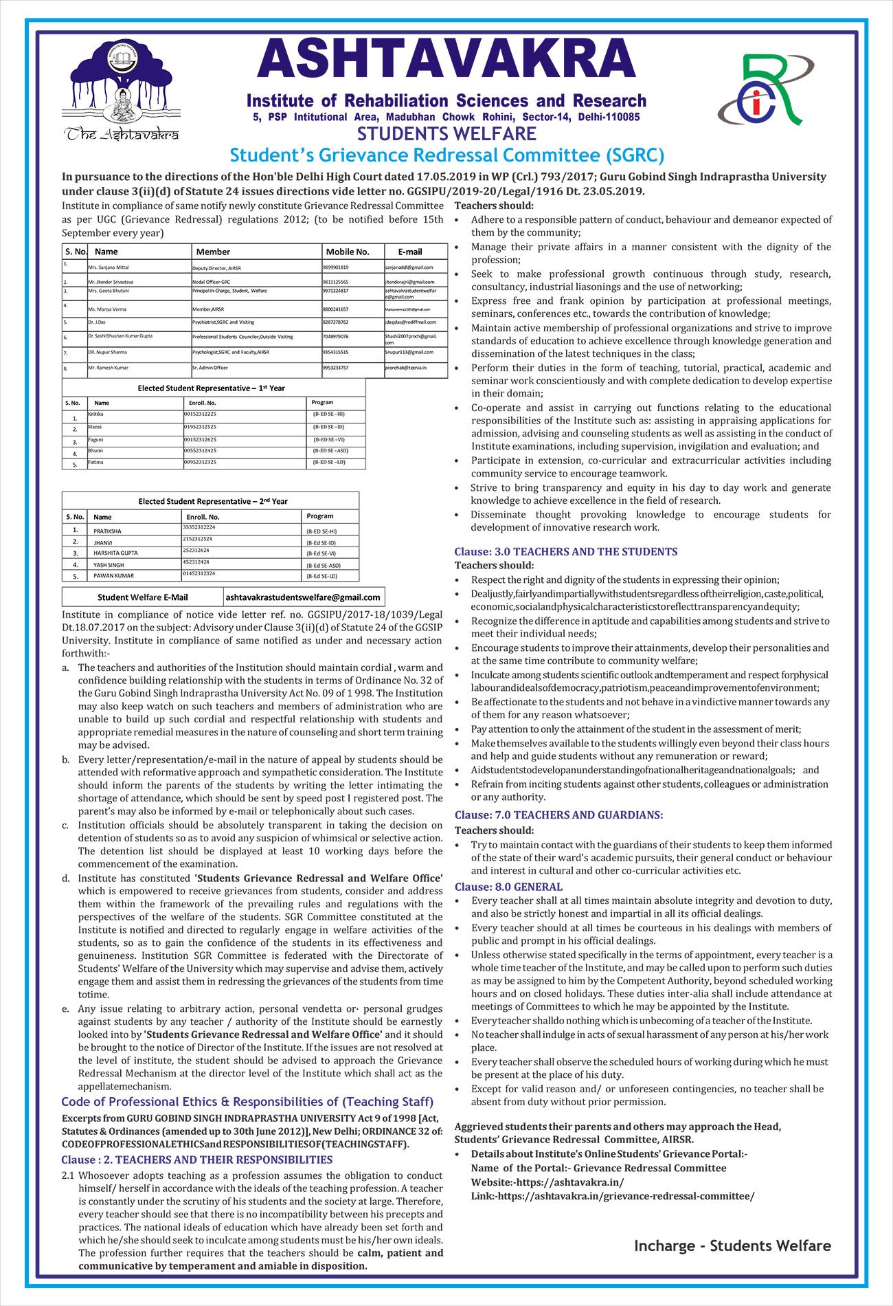 Students Grievance Redressal Committee is to provide opportunities for redress of certain grievances of students already enrolled in any institution, as well as those seeking admission to such institutions, and a mechanism thereto i.e. Student Grievances right from admission to conferment of degree may include issues Institution making admissions contrary to admission criterion or in contravention of merit List / qualification/ eligibility; non-issue of admission prospectus; false information in prospectus, Non-recognized Institutions, discrimination (on basis of caste, race, religion, disability etc), non-refund of Fee, original certificates on withdrawal, Ragging, unfair marking of attendance, debarring from exams, non-issue of Admit Cards, unfair marking, delayed Results, Issues related to Marksheet/ Degree, harassment etc.