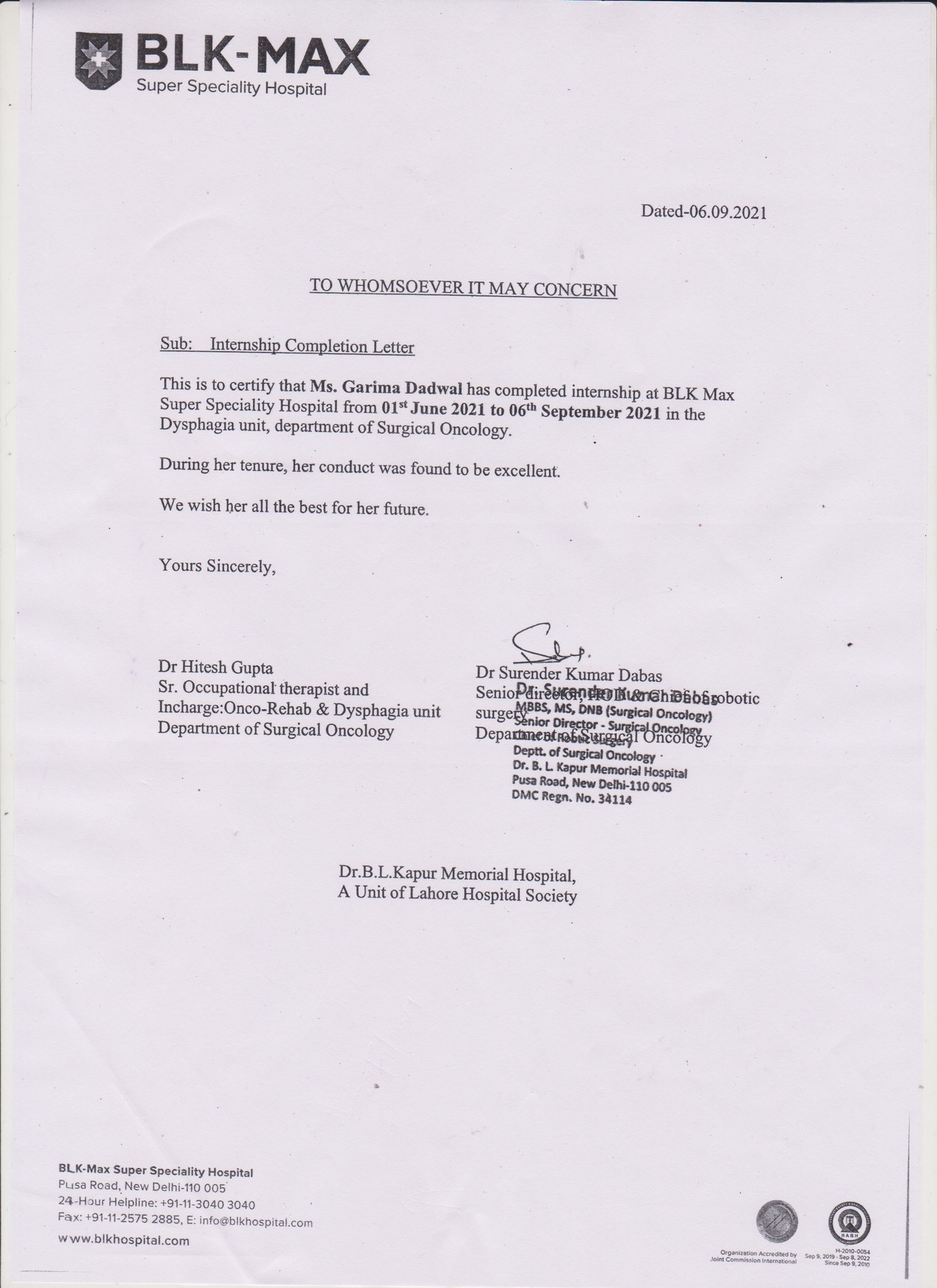 | 3. | 2021-2022. | BLK-MAX Super Speciality Hospital. | 06.09.2021 |  |